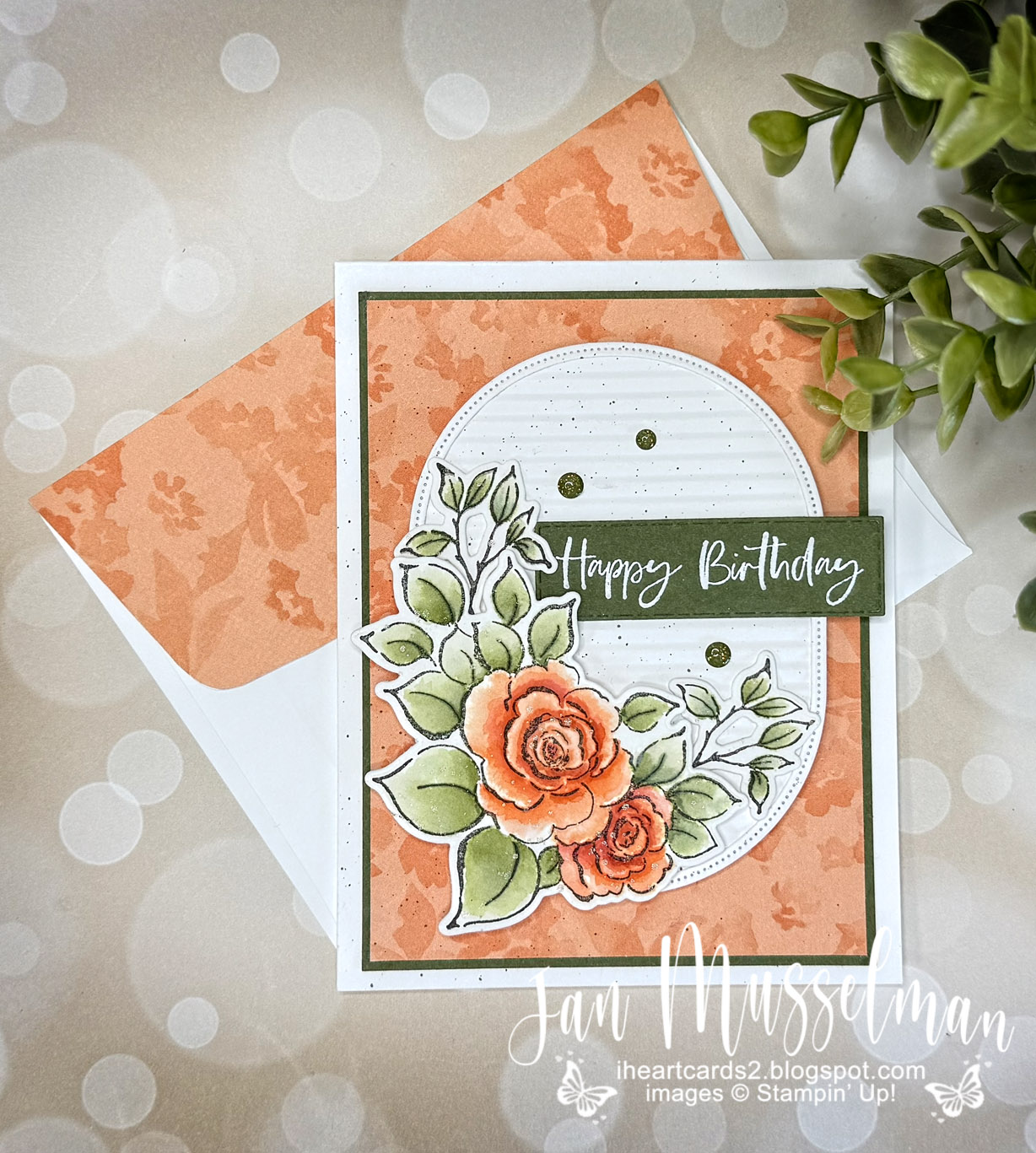 I used Timid Tiger & Mossy Meadow Inks to water color the large floral image & the leaf sprigs. My birthday sentiment has been heat embossed with White Wow Basic Embossing Powder on Mossy Meadow Cardstock that I die cut using the sentiment die from the Textured Notes Dies. And finally I added a few Low-Profile Sparkle Dots which is from the Painterly Pears Suite Collection.